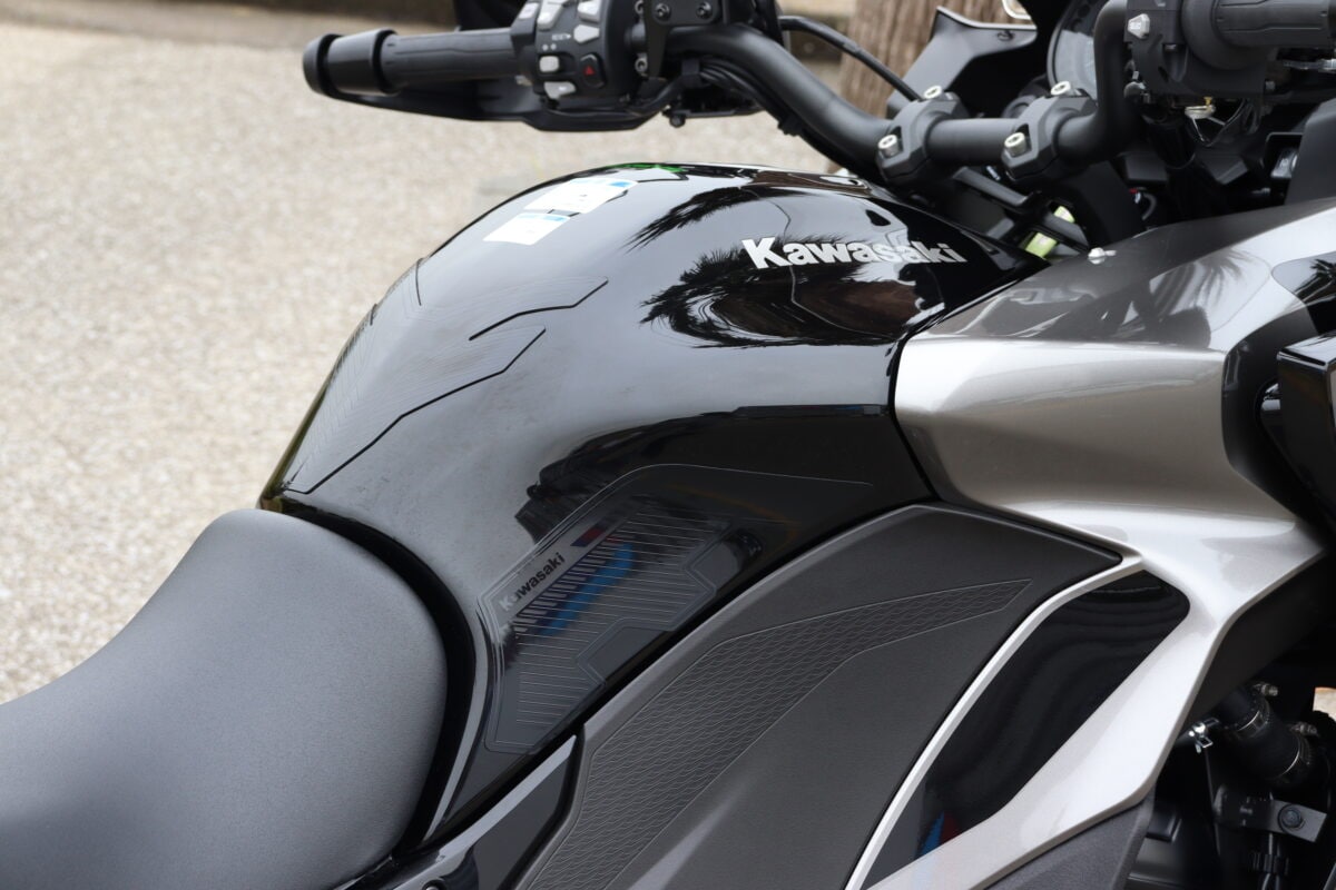 ストリートファイターらしい自然なポジション。幅広ハンドルのおかげで上体の自由度が高く、街乗りの適性は一番高そうだ。ハンドルは見ためより前方でやや遠く、適度な前傾姿勢になる。スポーツバイクらしく、ニンジャ1100SXよりも前傾はやや強めだ。