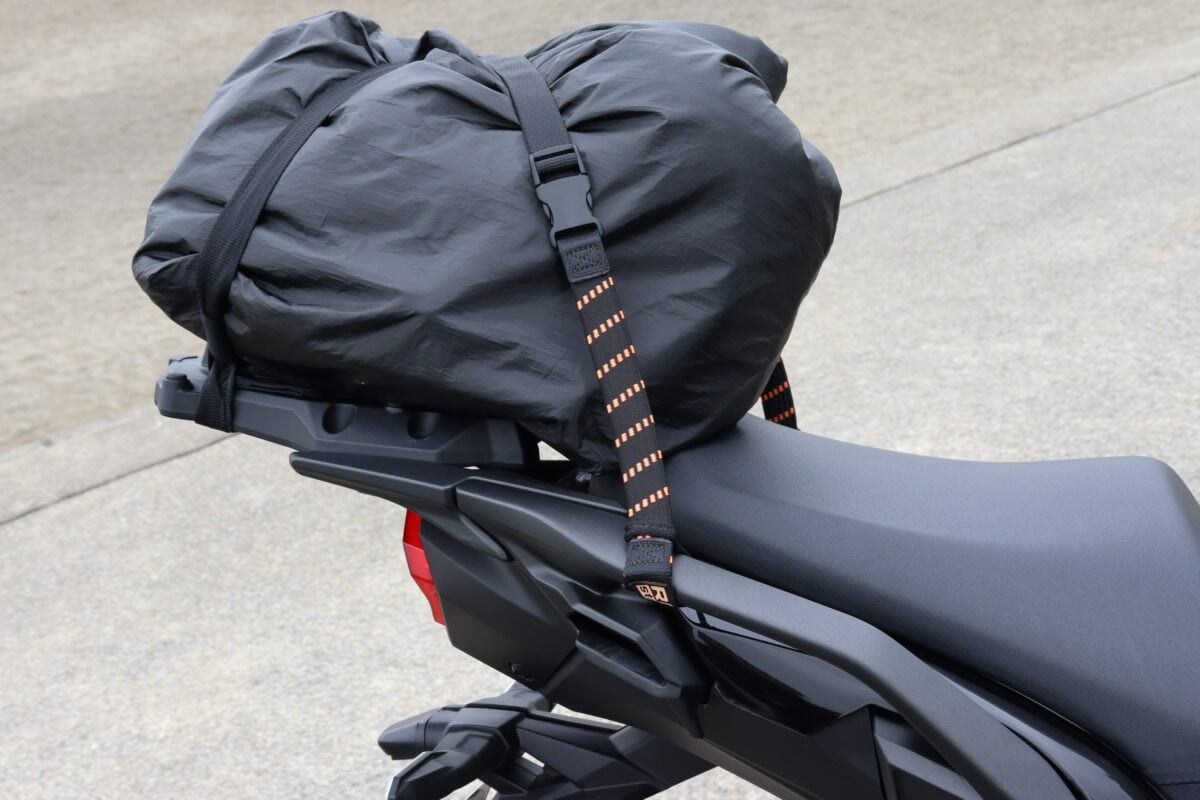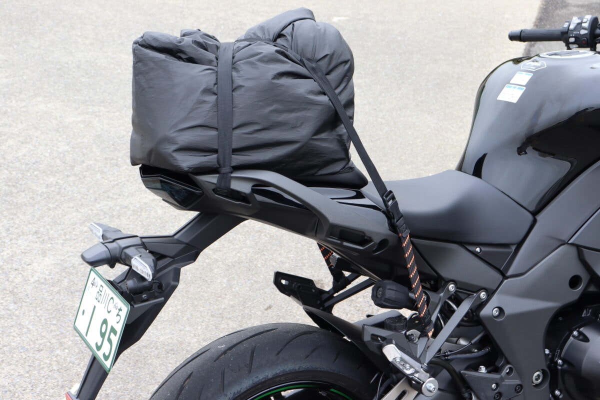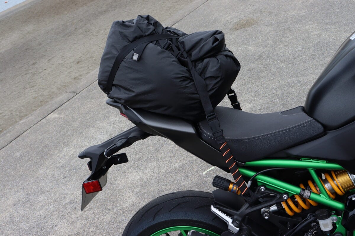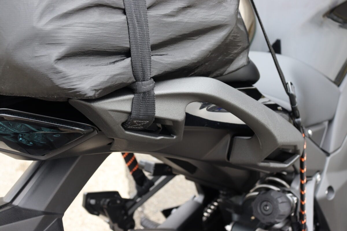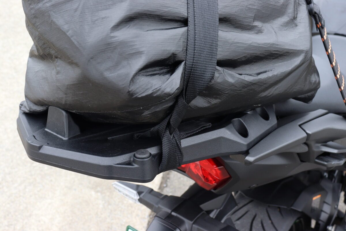 ベルトをかけるためのフックポイントがほとんどない。シートを取り外してシートレールにベルトを通す必要がある。ただ、タンデムシートは平面に近い形状のため荷物は安定するだろう
