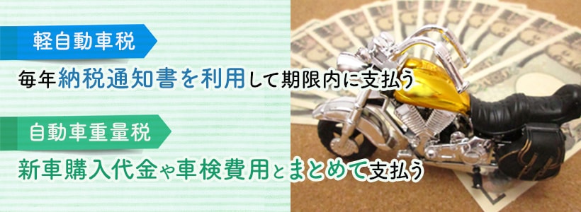 また、それぞれ支払い方法が異なり、特に軽自動車税に関しては自身で期限までに納税しなければなりません。うっかり支払い忘れのないように注意する必要があります。事前に郵送で届く納税通知書に期限や税額が記載されているため、届いたら内容をよく確認するようにしてください。