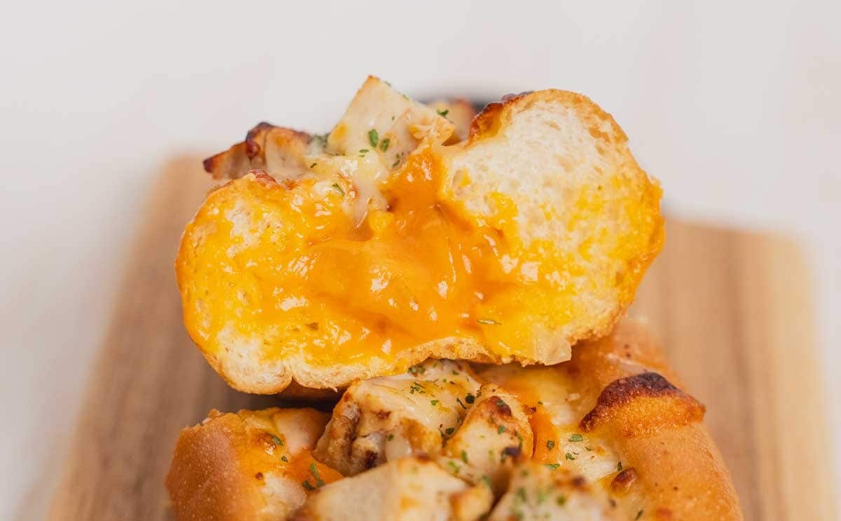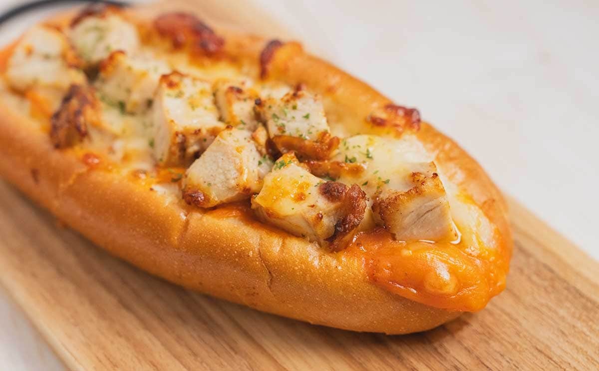 パンの真ん中に切れ目が入っていて、ソースと具材がたっぷりとサンドされています。