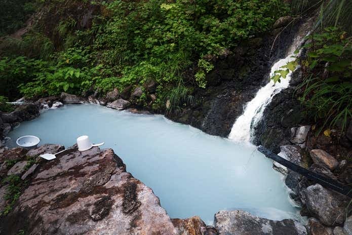 下山後は燕温泉の秘湯・河原の湯で、自然の中くつろげるのも大きな魅力。