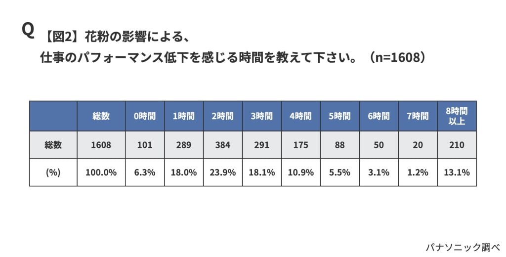 もうすぐ花粉症の本格的なシーズンが始まる。パナソニックは、花粉が社会人の労働力に与える影響を可視化するため、「花粉による労働力低下の経済損失額2026」を推計した。調査したのは昨年12月18日~12月19日。20歳から60歳までの社会人1651人(男性:1213人、女性:438人)の有効回答があった。