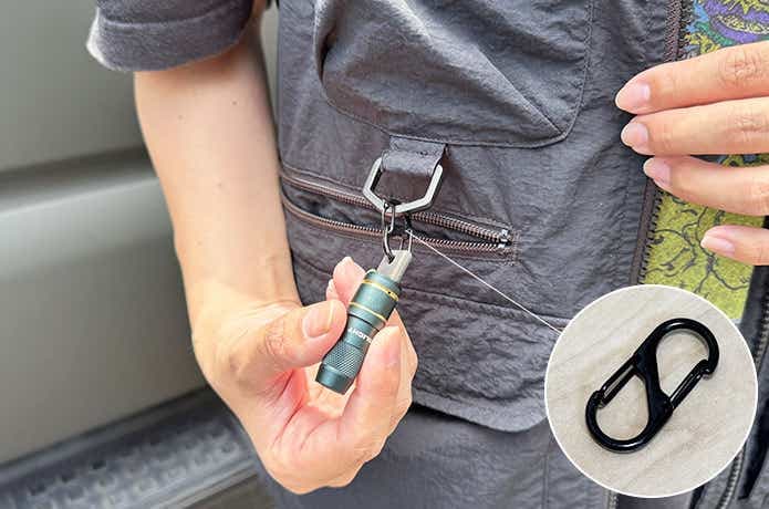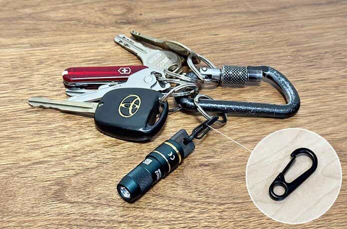 付属のカラビナはキーホルダーとして鍵等につけっぱなしにするにはちょうどいい形状なのですが、取り付け場所をコロコロ変える方には少し使いにくいのがネック。
