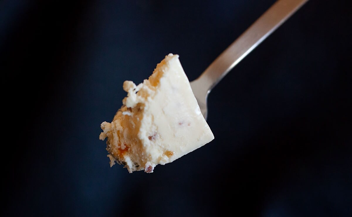 また、カラメルチップがとにかくナイスすぎる。カリッと食感のアクセントになっているのはもちろん、香ばしさと独特な甘みは味のアクセントにも。上だけ、などではなく、先ほどご覧いただいたように、全体に散っているのがいいですね。ブリュレっぽさと、チーズケーキっぽさの両方を味わえて、なんだか得した気分!!
