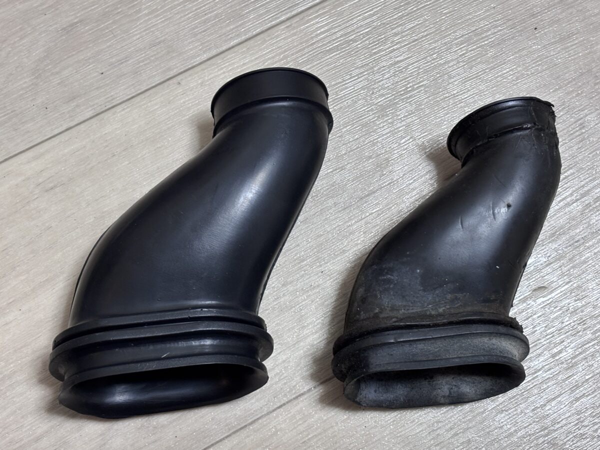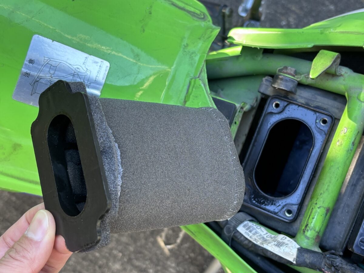 なんとエアクリーナーとキャブをつなぐダクトが劣化して縮んでいる! キャブにハマっていませんでした。つまりレーサーのような直キャブ状態です。エアクリーナーの抵抗がないから低回転域でトルクが出ず、高回転になったとたんに一気に加速したんでしょうね。