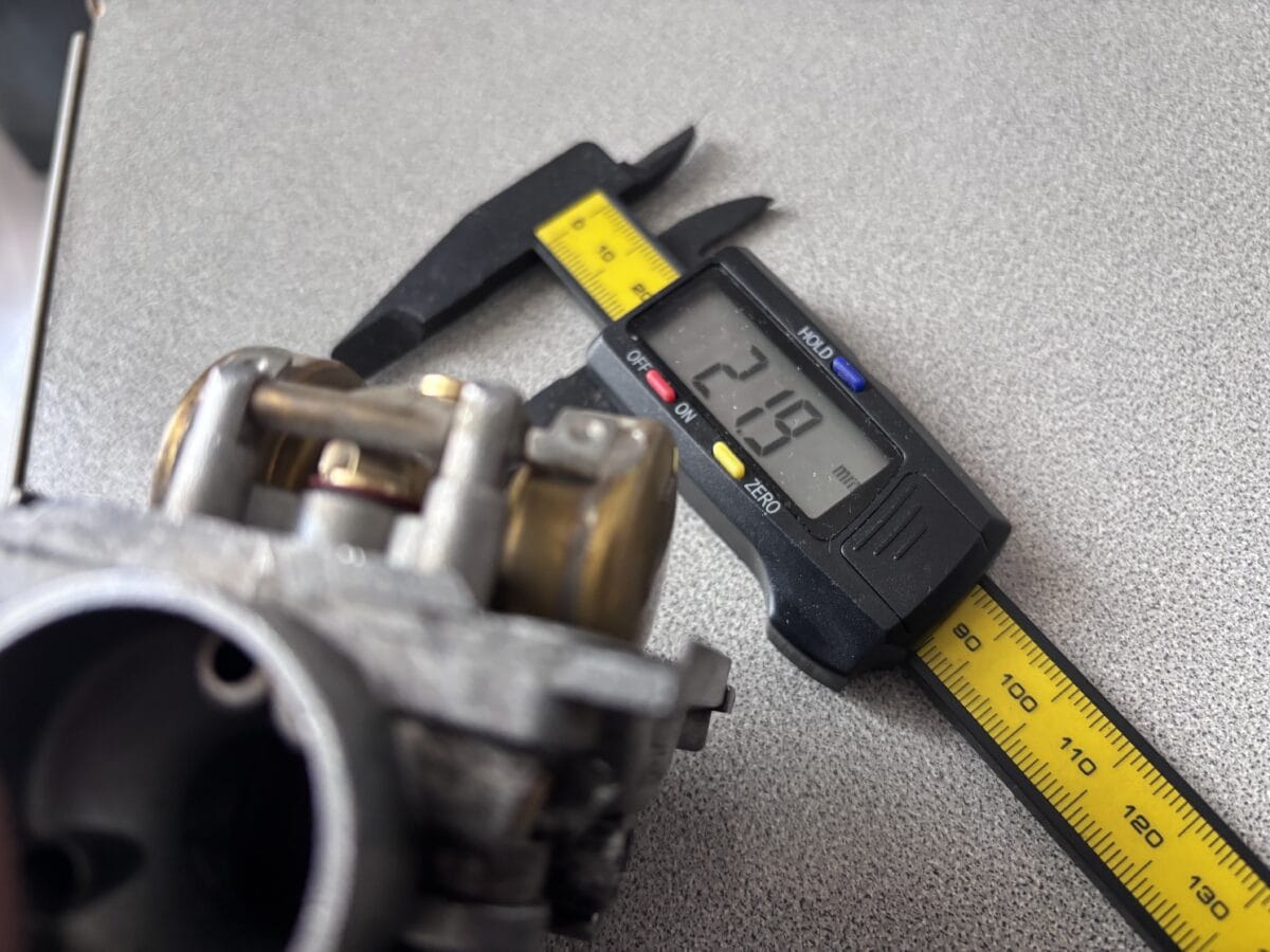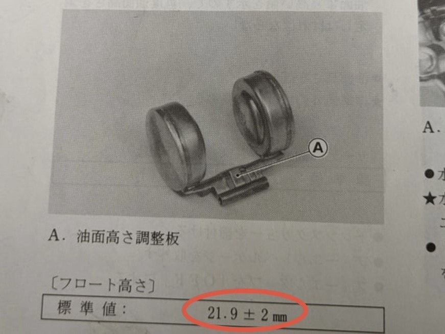 キャブレターを再び分解し、フロートレベルを計ってみたところ。19.4mmしかありません。サービスマニュアルによると適正値は19.9~23.9mm。つまり油面が高すぎました。