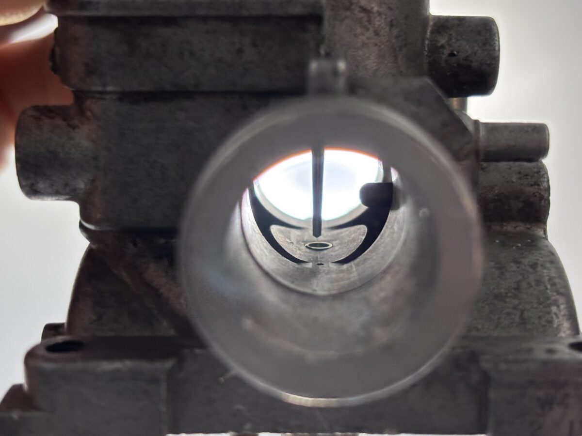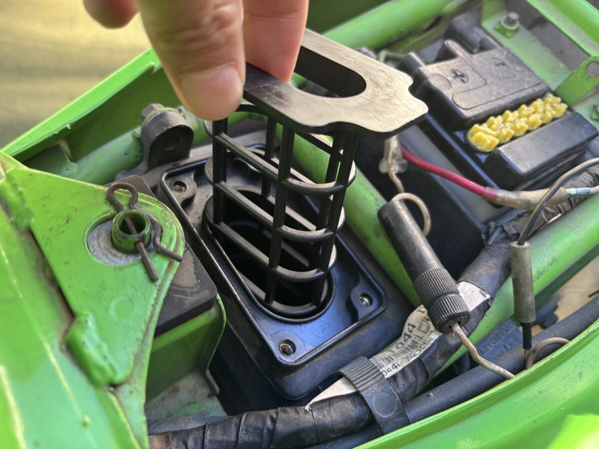 本来ならこのカゴみたいなパーツにスポンジのフィルターが付いているのですが、跡形もなく崩れ去っていました。この崩れたスポンジはキャブに吸い込まれた可能性が高いですね…。
