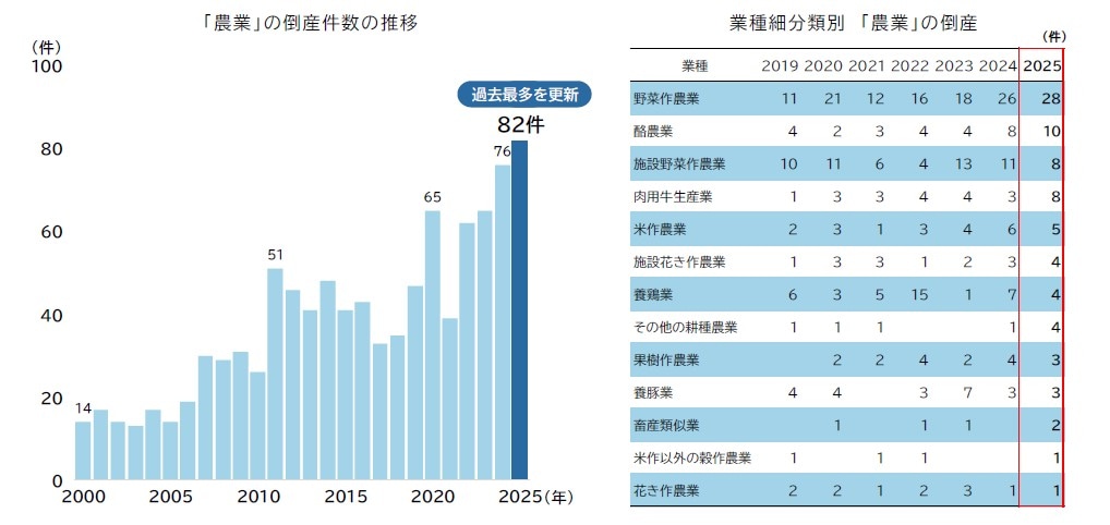 肥料や飼料の高騰はもちろん、天候などの外部環境に大きく左右される農業の苦労は「計算」できない。帝国データバンクの農業の倒産動向についての調査分析によると、2025年に発生した農業の倒産は前年比7.9%増の82件で、2000年以降初めて80件を超え、過去最多を更新した。