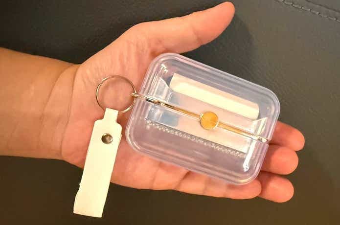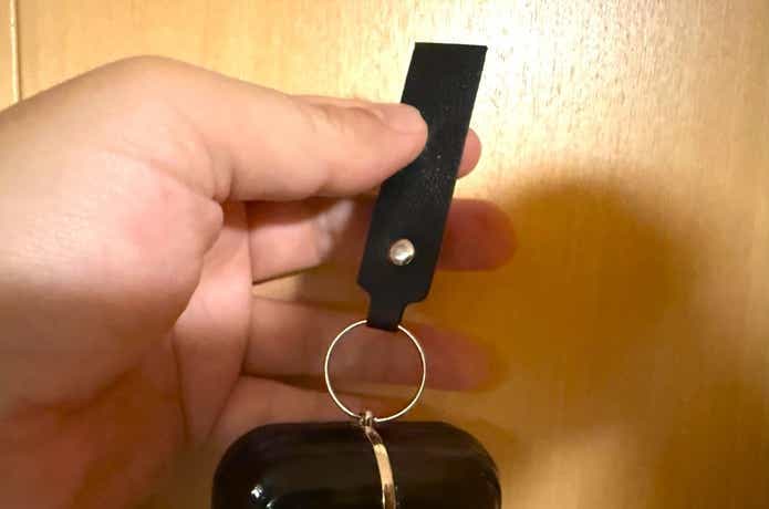 2.5×8cmのレザー調ストラップも付属していて、バッグに引っ掛けたり、玄関に吊るしたり、車内のフックに掛けたりできます。