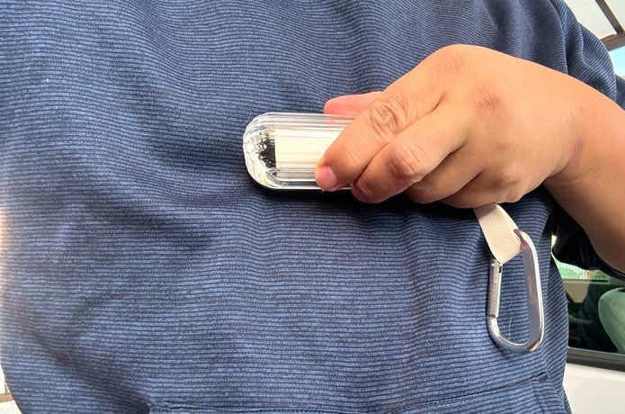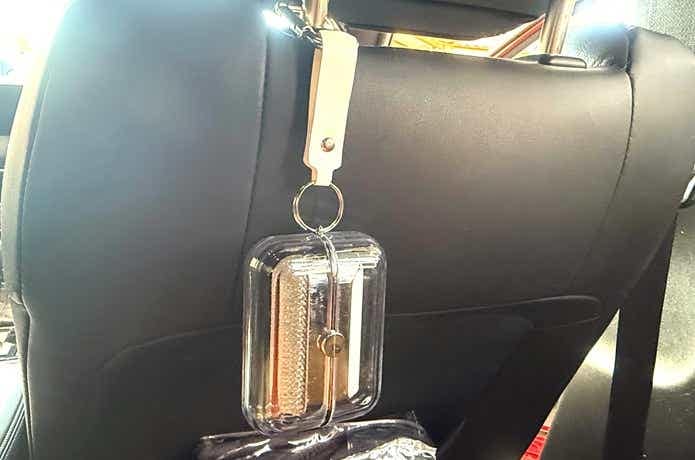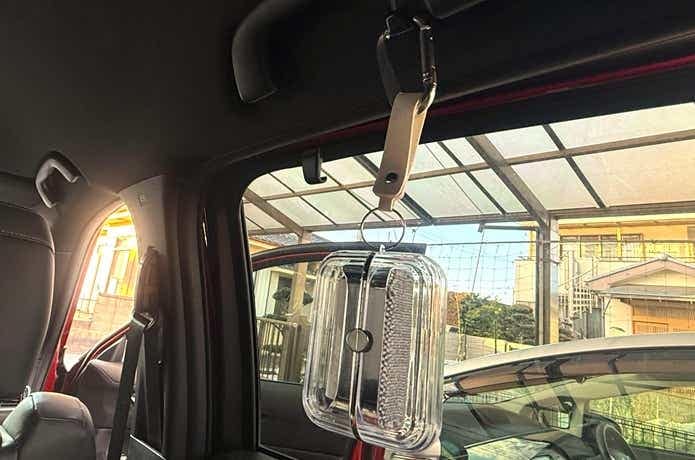特に便利そうなのは車内。カラビナを装着して、天井フックやヘッドレストに吊るしておけば、キャンプ帰りに服の付着物が気になったときなど、降りる前にいつでもササッと使えますね。