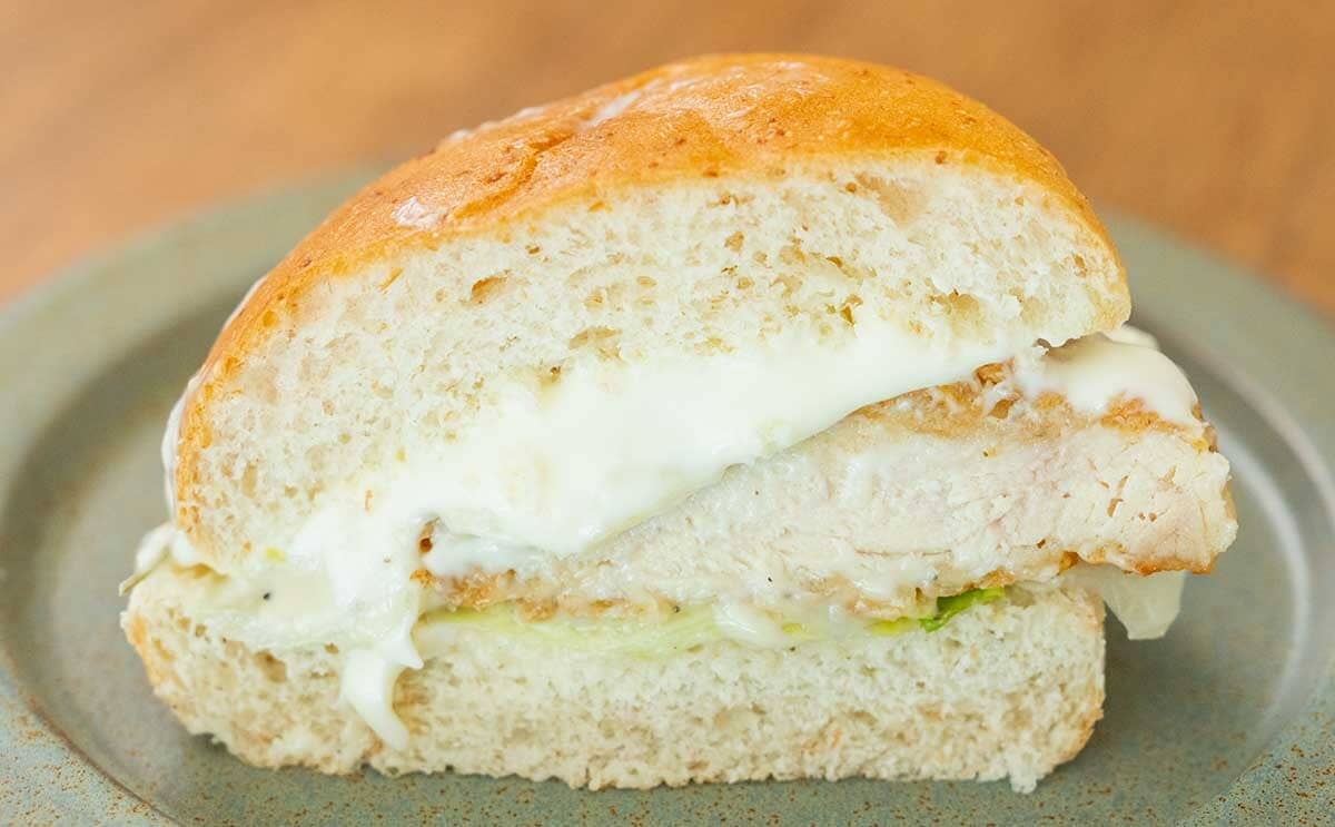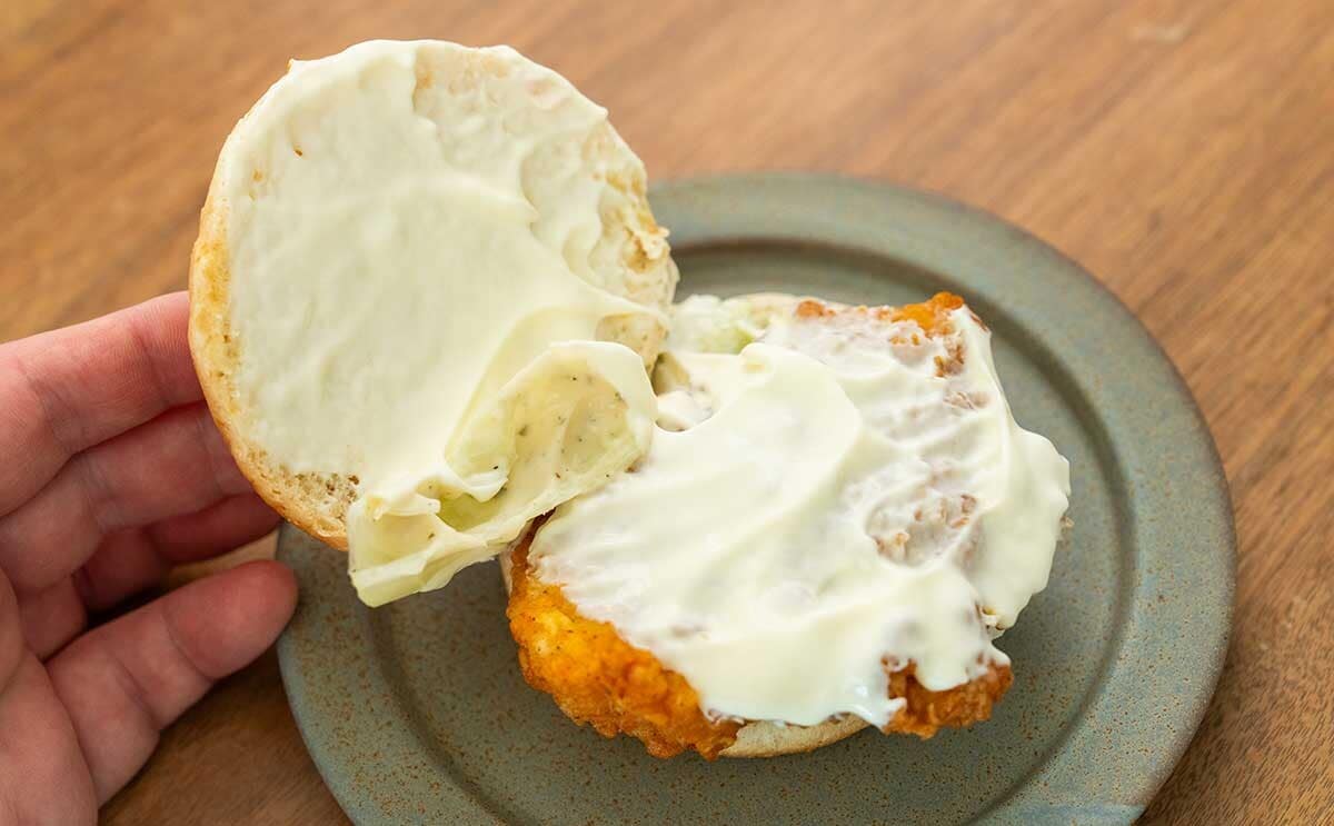 ひとくち食べた瞬間に、モッツァレラチーズのまろやかでクリーミーな味わいが口いっぱいに広がって最高! しっとり&ジューシーなチキンフィレとの相性が抜群に良いですね。でもそれだけでなく、バジルチーズソースも使われているため、あとからバジルの爽やかな風味も感じられます。チーズソースがたっぷりと使われていますが、バジルのおかげでくどさを感じない食べ心地になっていますね。