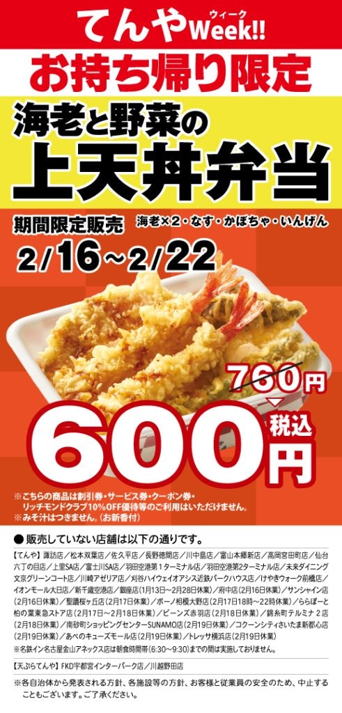「海老と野菜の上天丼弁当」が600円 てんやが2月16日から「てんやWeek!!」開催、“えび天無料券”の配布も