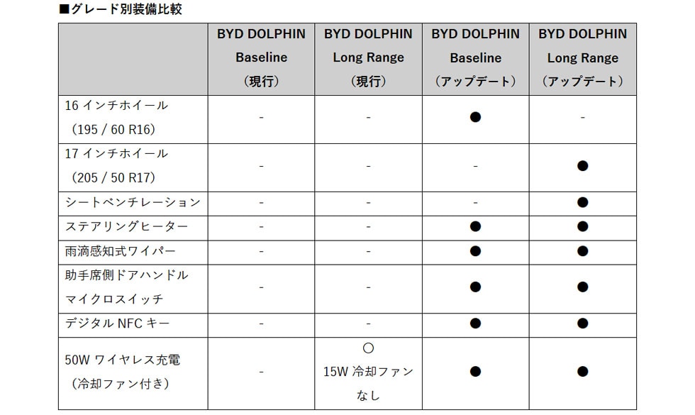 BYDオート・ジャパンは2026年2月10日、コンパクトEV「ドルフィン」の一部装備をアップデートし発売した。 今回発売する「ドルフィン」は、これまでの取り回しの良いボディサイズ、十分な航続距離、安全性、耐久性も高いブレードバッテリーに加え、価格を超える装備内容などが評価されてきた。 このような評価をさらに高め、より身近なEVとして積極的に選択されるモデルとなるべき、日本の顧客の声を反映する形で一部装備内容をアップデートし、快適性と先進性をさらに向上させている。 上位グレードの「Long Range」では、より快適かつ上質なドライブ体験を実現する専用装備を採用。これにより、あらゆるシーンでスマートなEVライフを実現している。 今回の改良は以下の通り。Baseline / Long Range共通装備ステアリングヒーター雨滴感知式ワイパーデジタルNFCキー冷却ファン付き50Wワイヤレス充電助手席側ドアハンドル マイクロスイッチ Long Range専用装備シートベンチレーション(運転席/助手席)新デザイン17インチアルミホイール 価格 BYD ドルフィン 関連記事BYD 関連記事BYDオートジャパン 公式サ […]