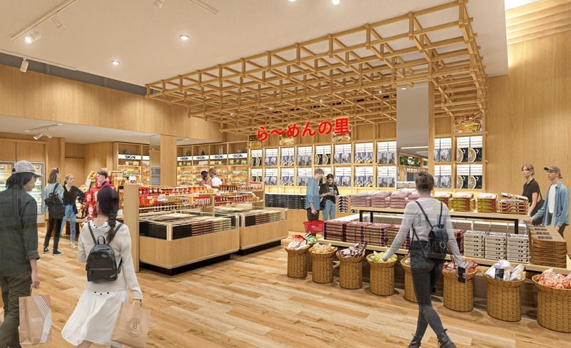 ショッピングコーナーには、天井まで木格子が連なる「らーめんウォール」が設置され、自分だけのお気に入りの一杯を探すことができます。そのほか、鬼怒川金谷ホテル直営の焼き菓子や、地元の若手生産者と開発した加工品など、栃木らしいお土産が勢揃いします。