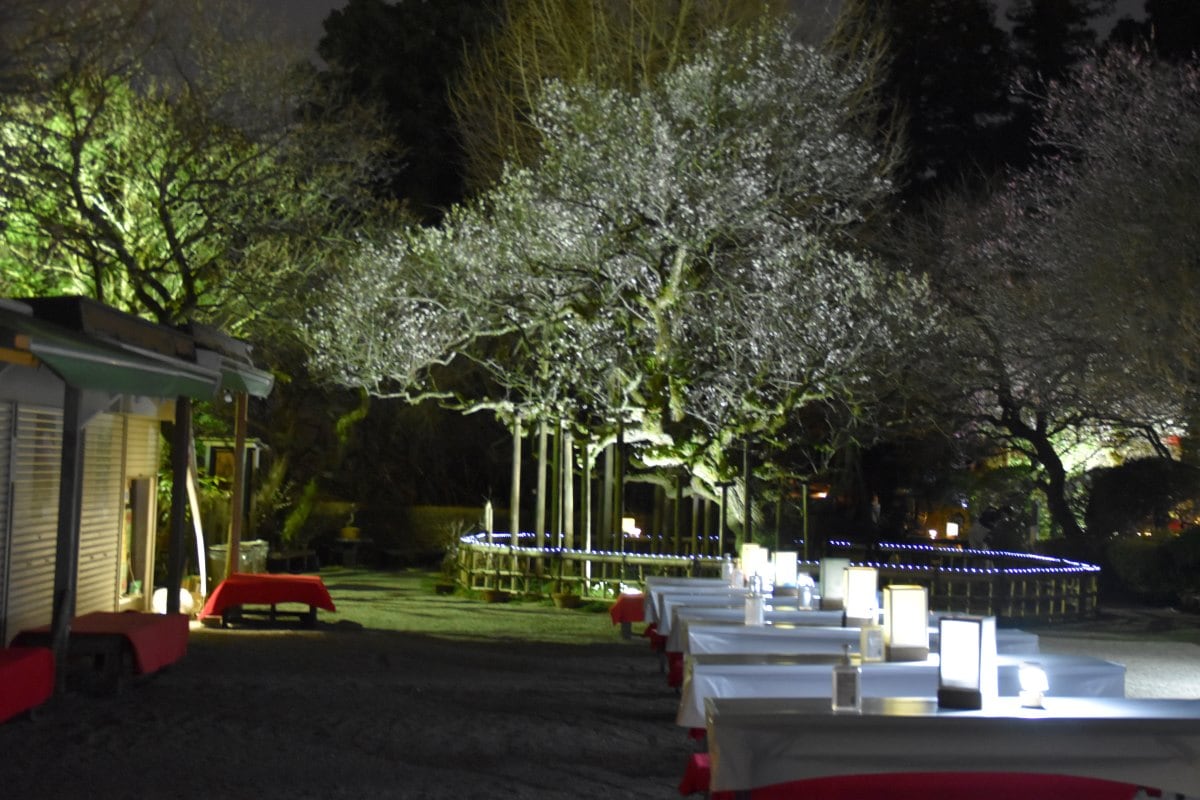 2月21日(土)~23日(月・祝)の3日間は、閉園時間が19時30分まで延長され、幻想的な「梅ライトアップ」が行われます。闇夜に浮かび上がる寿昌梅や、色鮮やかな番傘のライトアップは、昼間とは全く異なる幽玄な世界を演出します。