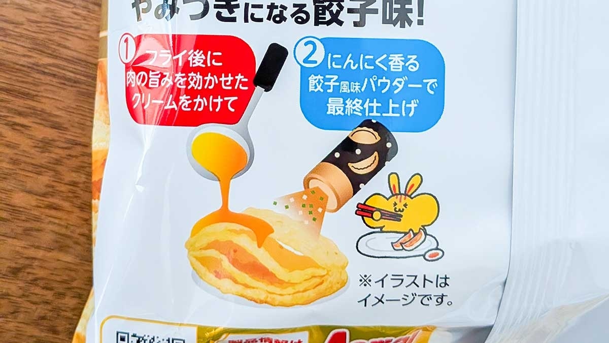パッケージの裏面には、「1.フライ後に肉の旨みを効かせたクリームをかけて」「2.にんにく香る餃子風味パウダーで最終仕上げ」と書かれていますね。