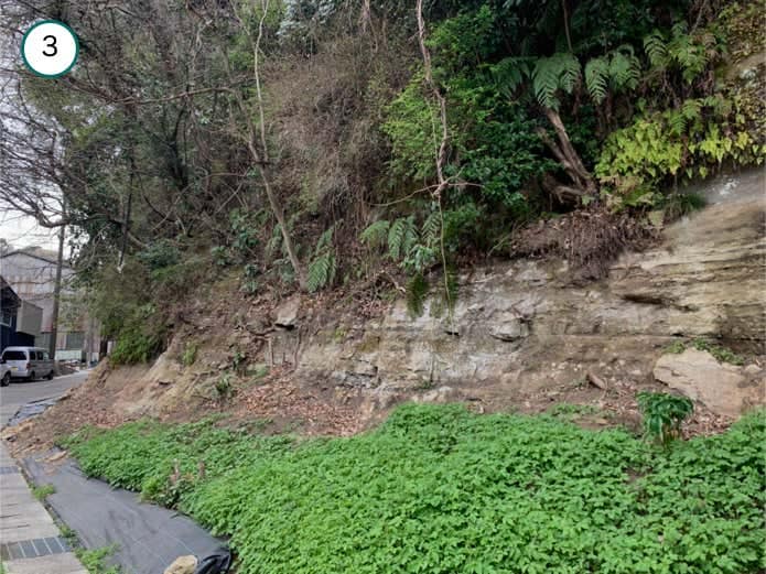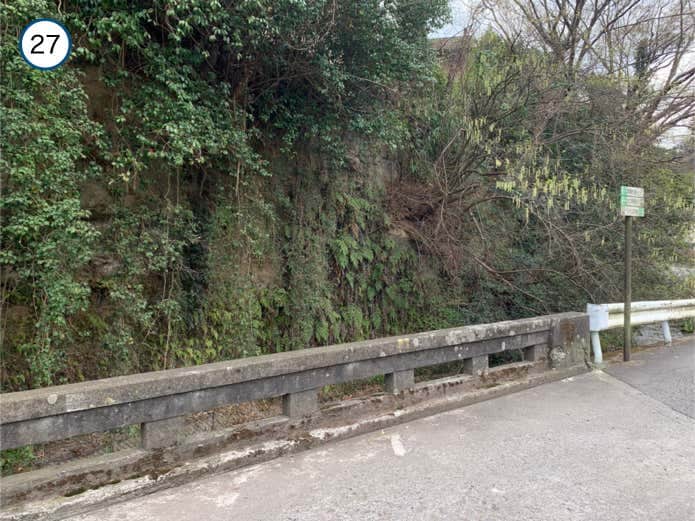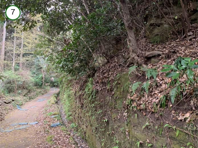 鉄工所の向かい側、右手の斜面には早速切通しの名残が現れます。