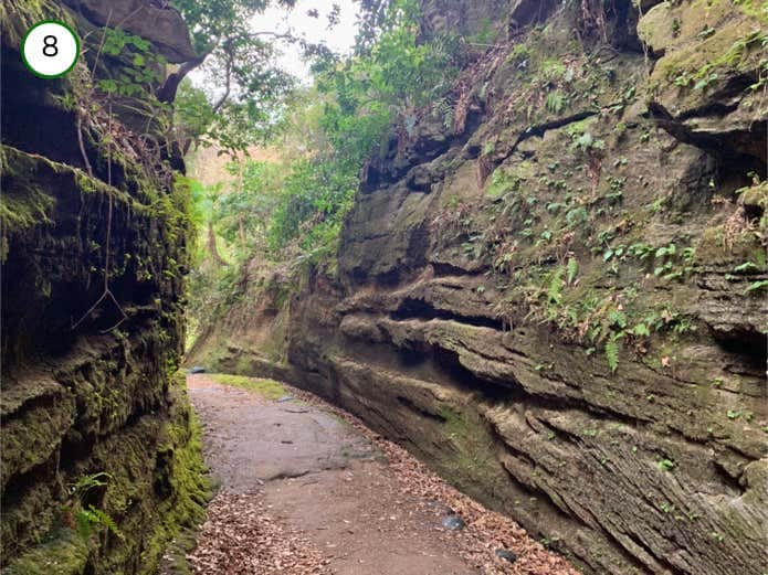 見上げると、ここまでよりも切通しの壁自体に高さがあり、スケール感のある場所です。