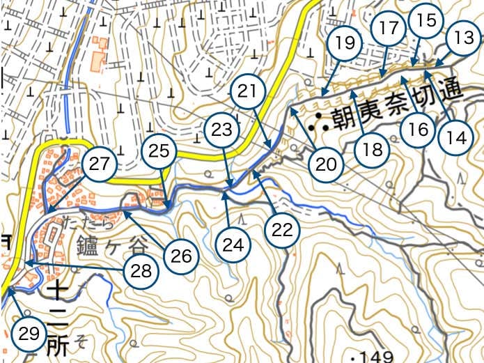 このセクションでは朝比奈切通しを通過しながら、太刀洗川(たちあらいがわ)の源流に沿って下っていきます。三郎の滝でハイキングコースは終わり、十二所バス停までは舗装路歩きとなります。
