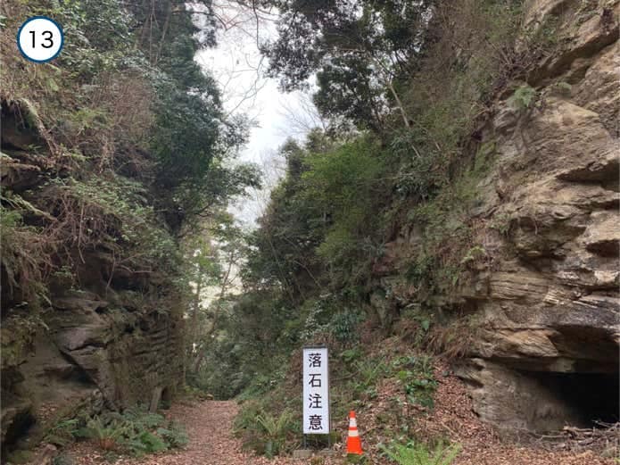 落石注意の看板が立てられた入口。いよいよここから朝比奈切通しへと入っていきます。