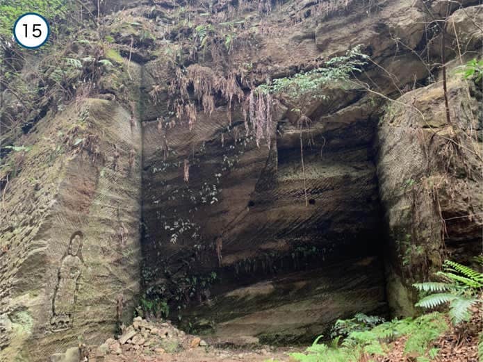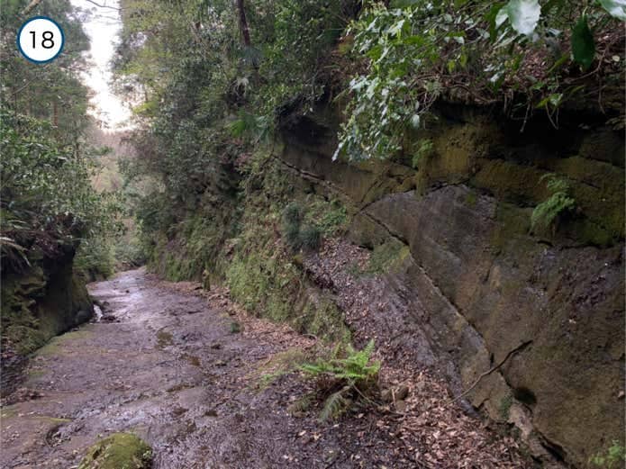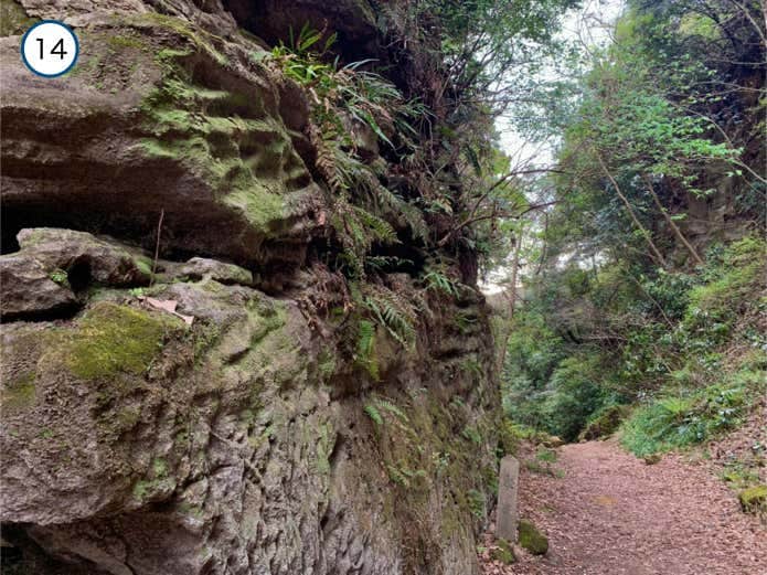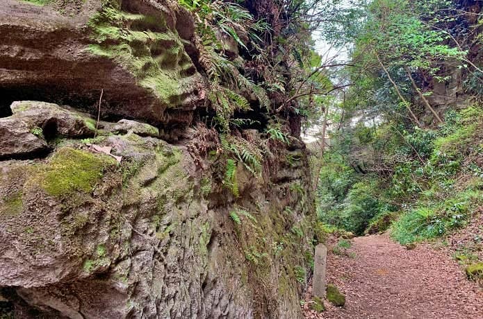 コース紹介で触れた千葉県・鋸山と同じく、朝比奈切通しなど鎌倉周辺は凝灰岩という比較的柔らかい地質で構成されています。このため切通しを作ることが可能であったと考えられますが、鋸山ですら採石が始まったのは朝比奈切通し完成から600年以上を経た江戸時代後期なのです。