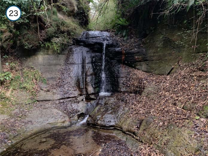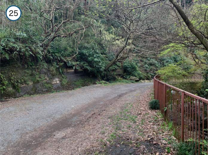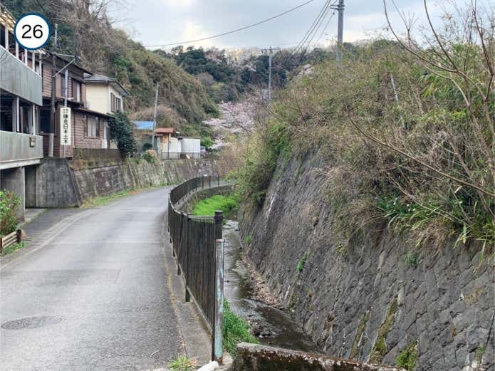 この下り坂は滑川の支流・太刀洗川の源流部にあたり、常に水が流れています。雨の日には水量も増えるので、スリップには注意しましょう。