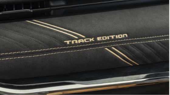 - テュペロブラウンとブラックの配色と、Track Edition刺繍入り専用トリムで上質な内装