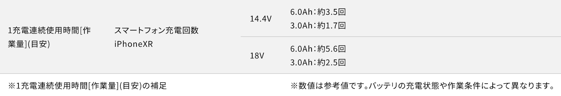 公式サイトによれば、今回使った18V(6.0Ah)のバッテリーの場合、iPhone XRが5回フル充電できるとのこと。これはかなり頼もしい!