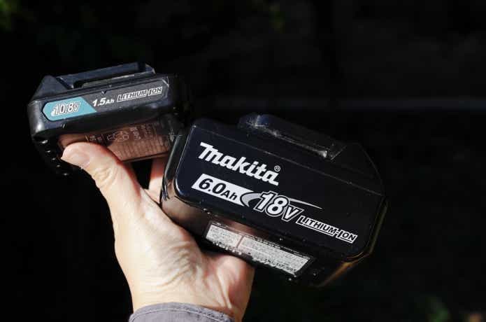 マキタといえば「青みがかった緑色」がトレードマークですが、じつは上の写真のような「ザ・緑色」も存在しています。これはいわゆるDIY用モデルで、バッテリーも「ライトバッテリー」といって、仕様が異なるもの。