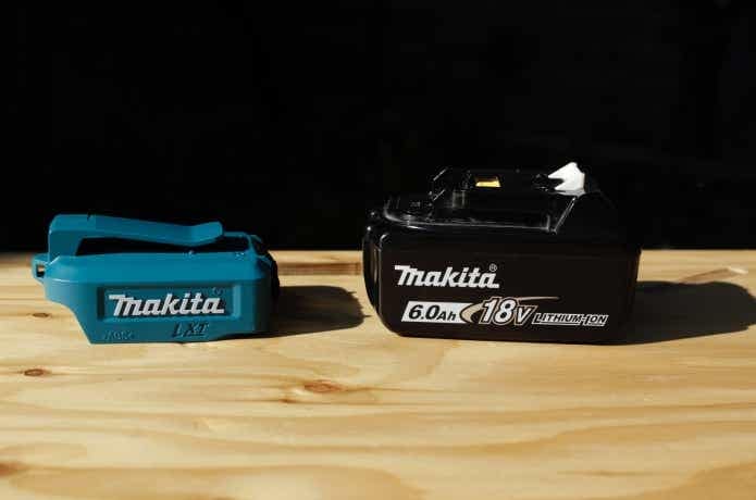使用するのは、マキタの充電式ファンで使っている18V(6.0Ah)のバッテリーと、USB用アダプタ(ADP05)です。