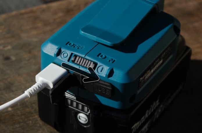 じつは、マキタのバッテリーでスマホやLEDライトが充電できるようになる「USB用アダプタ」。こんなふうにUSBポートがついているんです。