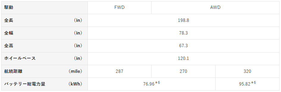 Highlander(BEVモデル・北米仕様)主要諸元(開発目標値)