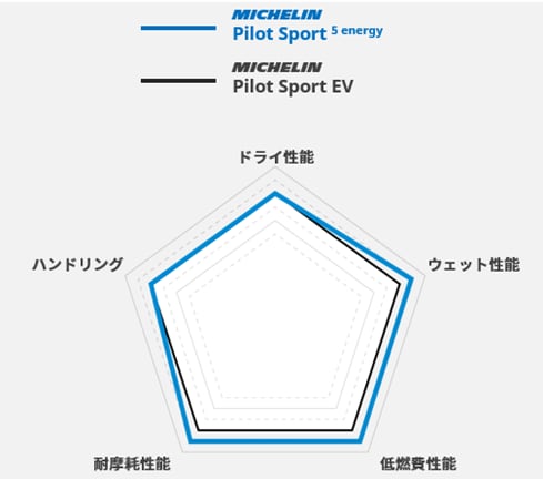(2)【試験条件】〇タイヤサイズ 245/45R20 103Y XL (Pilot Sport 5 Energy), 245/45R20 103Y XL (Pilot Sport EV) 〇試験空気圧 230kPa 〇試験荷重 1名+計測機器 〇試験リム幅 7.5J 〇試験車両名 LEXUS RX350h 全輪駆動 〇 試験場 GKNドライブライン試験場 〇試験方法 80km/hから完全停止までの制動距離を測定 〇制動距離 MICHELIN Pilot Sport 5 EN 29.27m , MICHELIN Pilot Sport EV 30.29m, 〇詳細なテスト条件と結果はタイヤ公正取引協議会に届け出てあります。 テスト結果はあくまでテスト値であり、普遍的なものではありません。