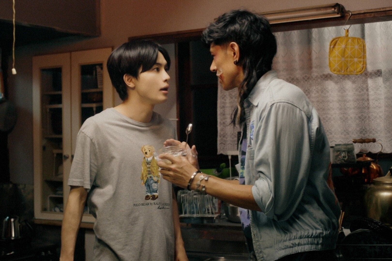 (C)「俺たちバッドバーバーズ」製作委員会日暮(中島歩)は月白(草川拓弥)のプリンを食べてしまう