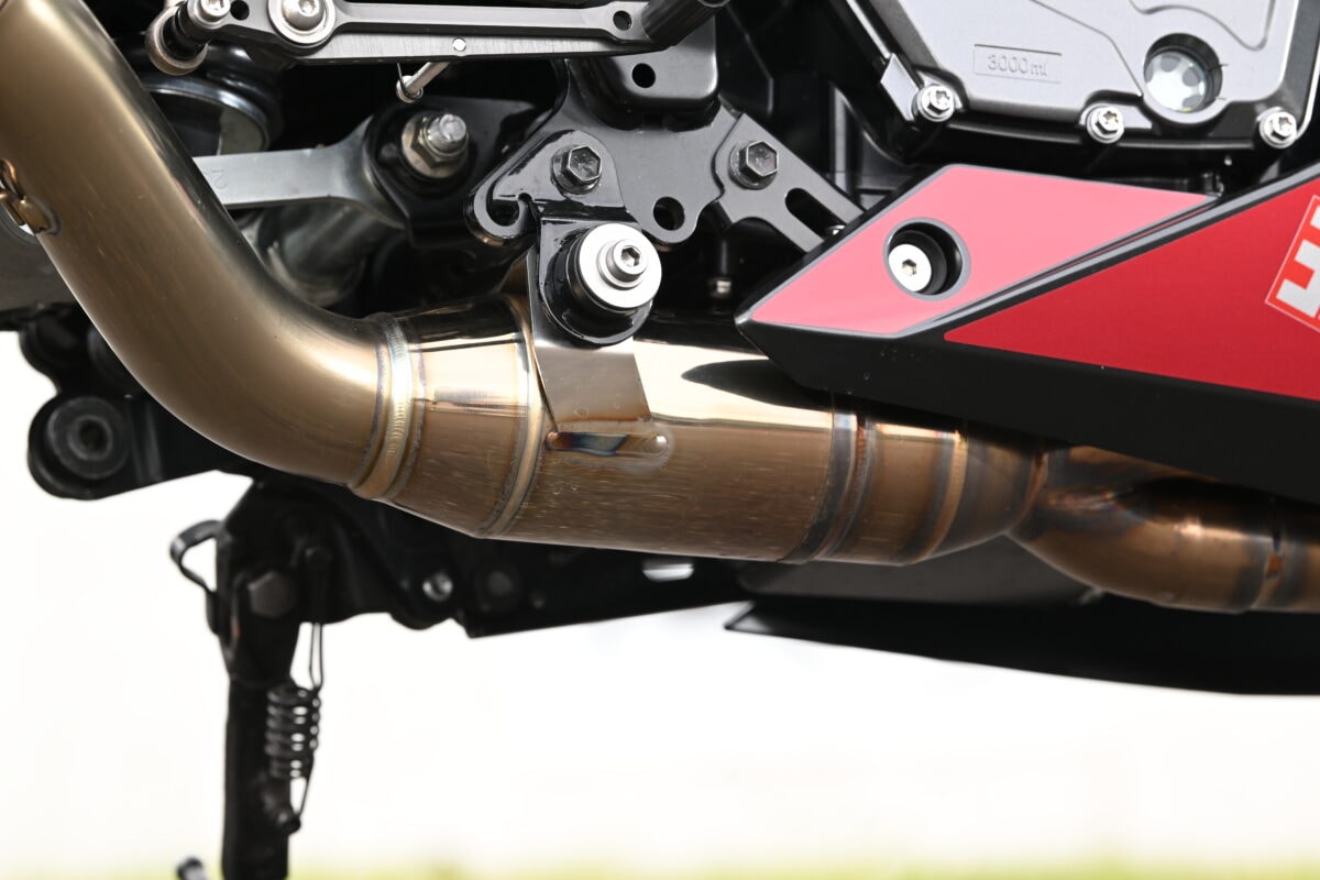「ヨシムラがマフラーを作るなら、やはりモアパワーですよね。目標は全回転域でひと山パワーカーブを乗せること。そのために、パイプ径とパイプ長を選定してレイアウトを決め、集合部の位置や連結パイプの位置を研究開発しました」(井藤さん)
