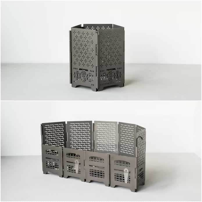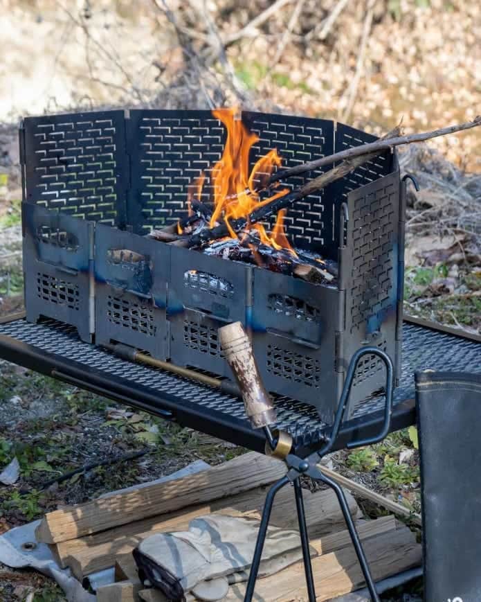 スタンダードのロダンは五角形の筒状ですが、なおさんは別売りの「HANGETSUセット」を組み合わせることで火床が半月状に広がり、よりゆったりと焚き火を味わえるスタイルに。