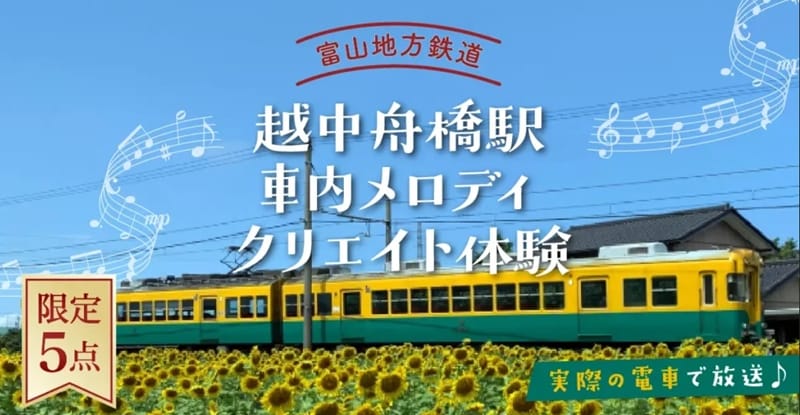 富山県の名門私鉄・富山地方鉄道がユニークなビジネス(サービス)を始めた。名付けて「越中舟橋駅・車内メロディクリエイト体験」。プロアマ問わず作曲家やシンガーソングライターのオリジナル作品を、越中舟橋駅(舟橋村)に到着する電車の車内で流す。