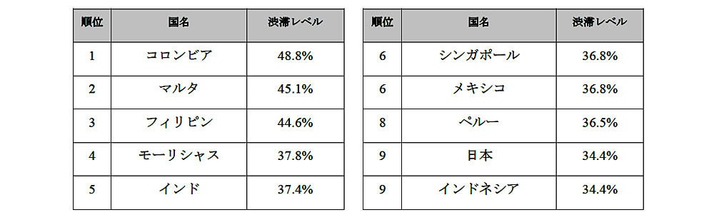 国別では、コロンビアが平均渋滞率約50%で首位となり、日本は約34%でインドネシアと並ぶ9位。アジア地域ではフィリピン、インド、シンガポールに次ぐ4位の結果であった。