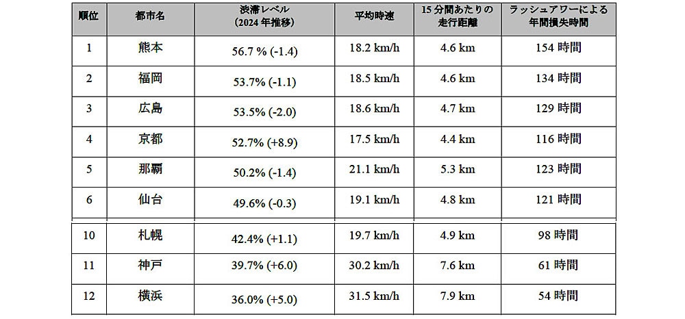 2025年、トムトムは日本国内の主要12都市を対象に交通データの詳細な分析を実施した。各都市における渋滞レベル、平均時速、15分間あたりの走行距離、およびラッシュアワーによる年間損失時間の結果は下記の通りとなる。
