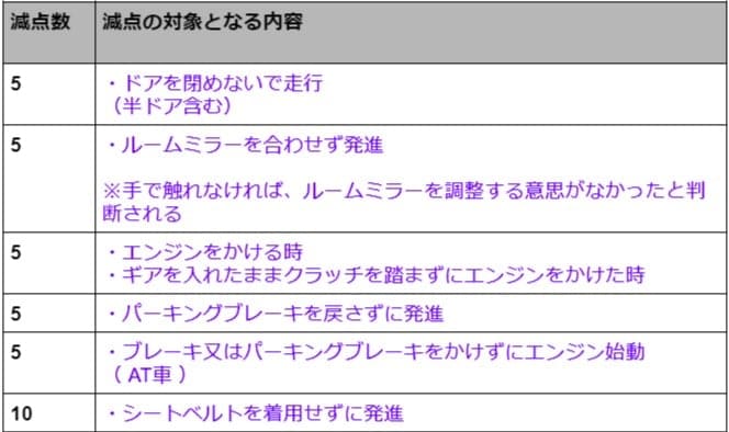 乗降用のドアを閉めない、ルームミラーを調節しない、エンジンを始動させる方法に誤りがあるなどが、5点分の減点を受ける対象です。
