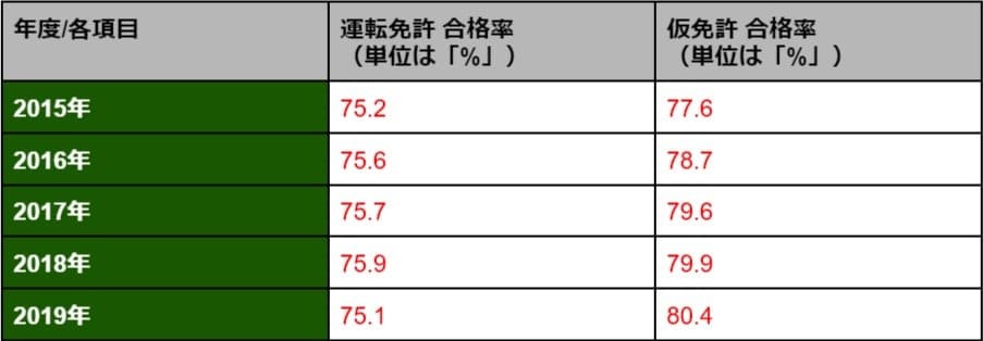 2019年度の運転免許合格率は75.1%。4人のうち3人は合格している割合です。また、仮免許の合格検定は80.4%と、自動車学校の第1段階で受講した学科教習・技能教習の理解率が高いのが見て取れます。