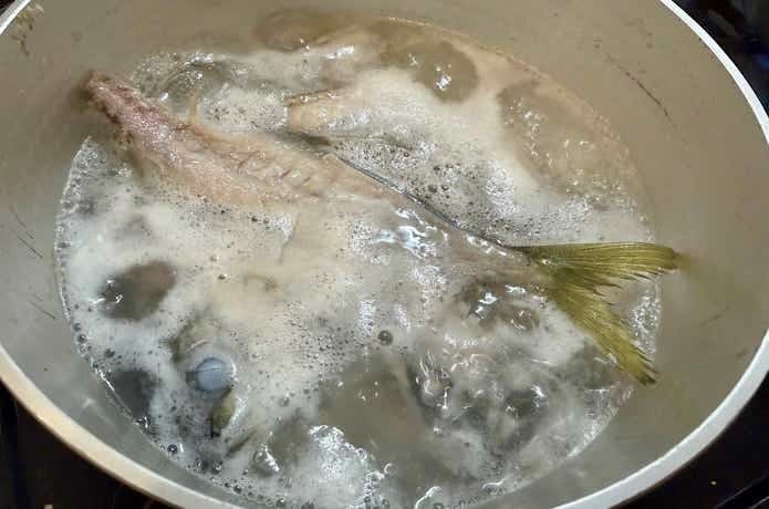 ①鍋に水と霜降りして汚れを落とした魚のアラを入れ、強火にかけ、沸騰させた状態を保ちながら30分煮ます。