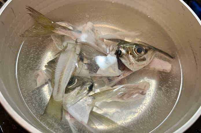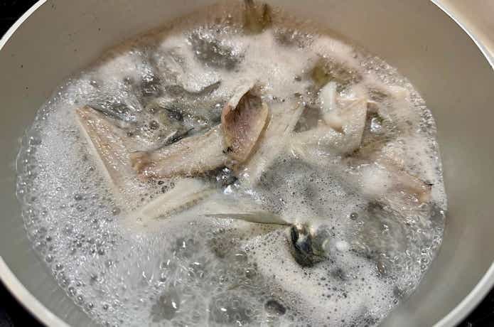 ①鍋に600mlの水を入れて沸かし、霜降りして汚れを落とした100gの魚のアラを入れ、20分弱火にかけます。