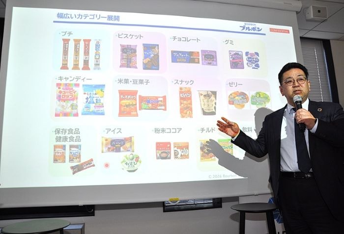 記者会見には、販促業務の効率化のためゴウリカマーケティングのサービスを利用している大手菓子メーカー・ブルボン(新潟県柏崎市)の常務取締役・井手規秀さんが同席。菓子製品の販促PRで必要となるボード制作業務の仕組みを変えた経験を語った。井手さんは「分かりやすく説明すると、ゴウリカさんのサービスを利用したことで、ボード制作業務に関わっていた社員の送信メール数は50本から1本になりました。弊社はボードのデザインを決めるだけで、その後の業務はゴウリカさんに担ってもらう仕組みにしました。これまでより業務コストは4割ほど削減できました」と説明した。