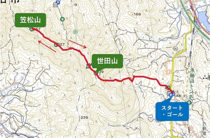世田薬師バス停(10分)→世田薬師(60分)→世田山(30分)→笠松山(30分)→世田山(35分)→世田薬師(5分)→世田薬師バス停