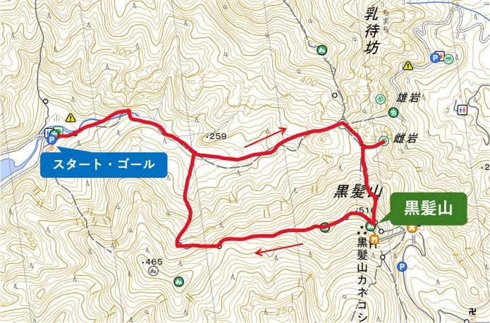 竜門峡キャンプ場(60分)→見返峠(5分)→雌岩(35分)→黒髪山(5分)→蛇焼山(15分)→後の平(45分)→竜門峡キャンプ場
