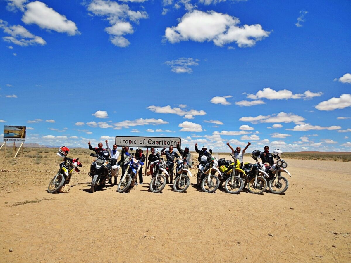 途中で 南回帰線(Tropic of Capricorn) に到達。標識前でバイクを並べ記念撮影。南緯23度26分、熱帯と温帯の境だ。