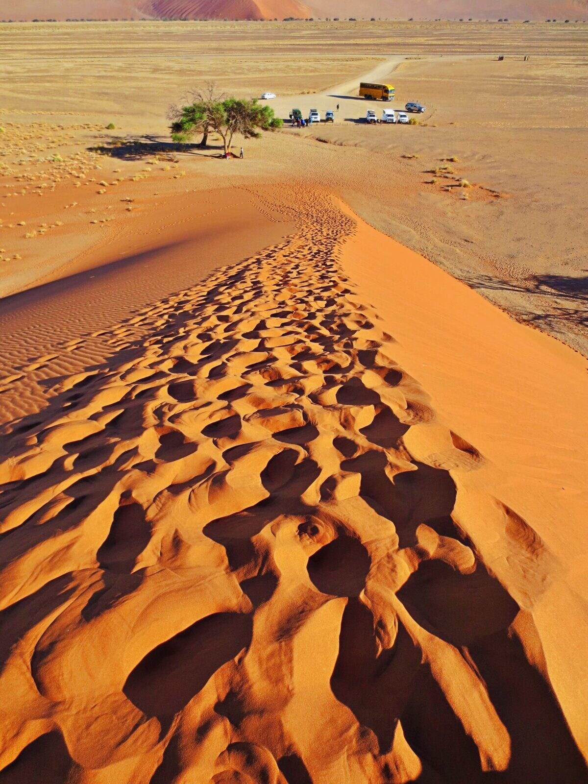 375キロ走り、砂丘観光の拠点「セスリエム・キャンピング」へ。翌朝、デューン45(Dune 45) に登る。夜明け、金色に輝く砂丘のグラデーションが刻々と変化する。あの瞬間、ナミブ砂漠の大地とひとつになった気がした。