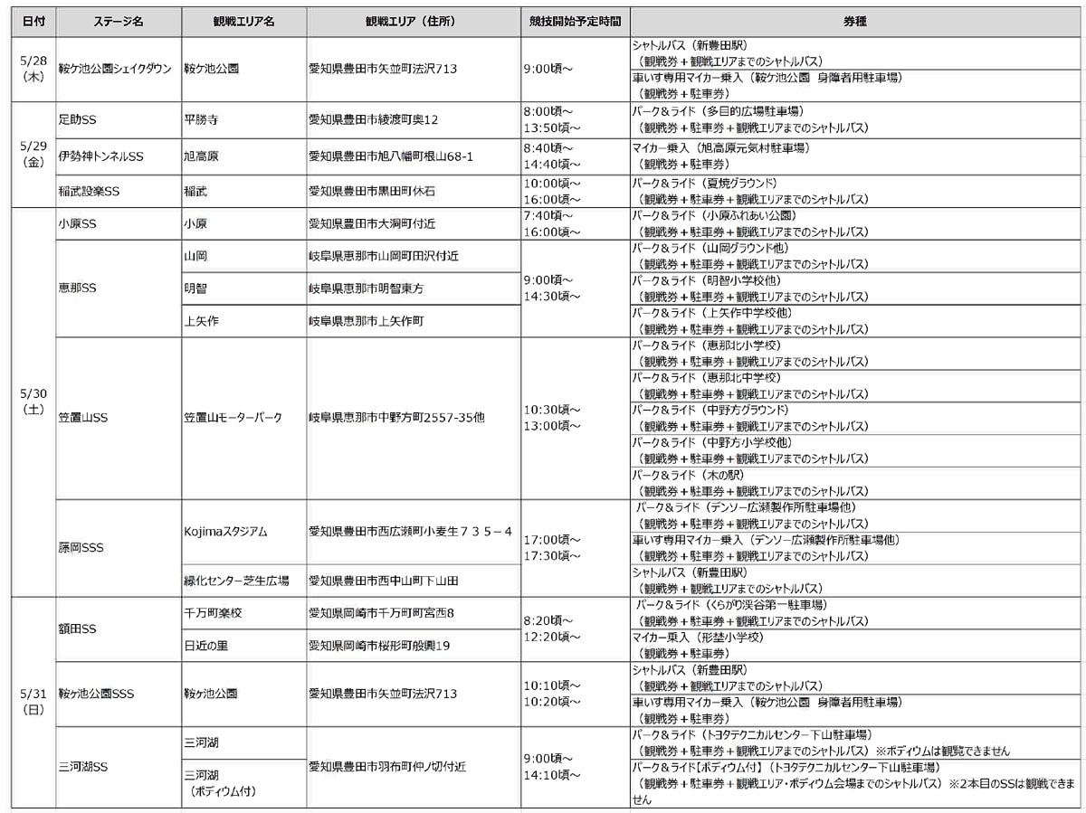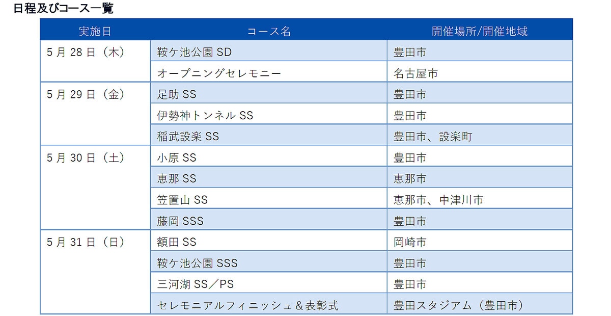 さらに、新たに「藤岡 SSS (スーパースペシャルステージ)」が登場するほか、最終日には「鞍ケ池公園 SD」の走行方向を逆向きにした「鞍ヶ池公園SSS」を設定している。最終日に豊田スタジアムで行なわれるセレモニアルフィニッシュで表彰式が行なわれる。