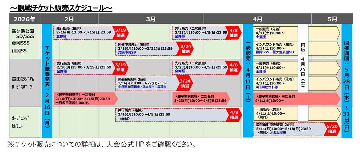 観戦チケットは2月16日から先行抽選販売が開始となるほか、先着販売となる宿泊プランの受付も順次始まる。また、ふるさと納税の返礼品としても観戦チケットを入手できる新しいオフィシャルグッズは、2月16日からオンライン販売が開始される。